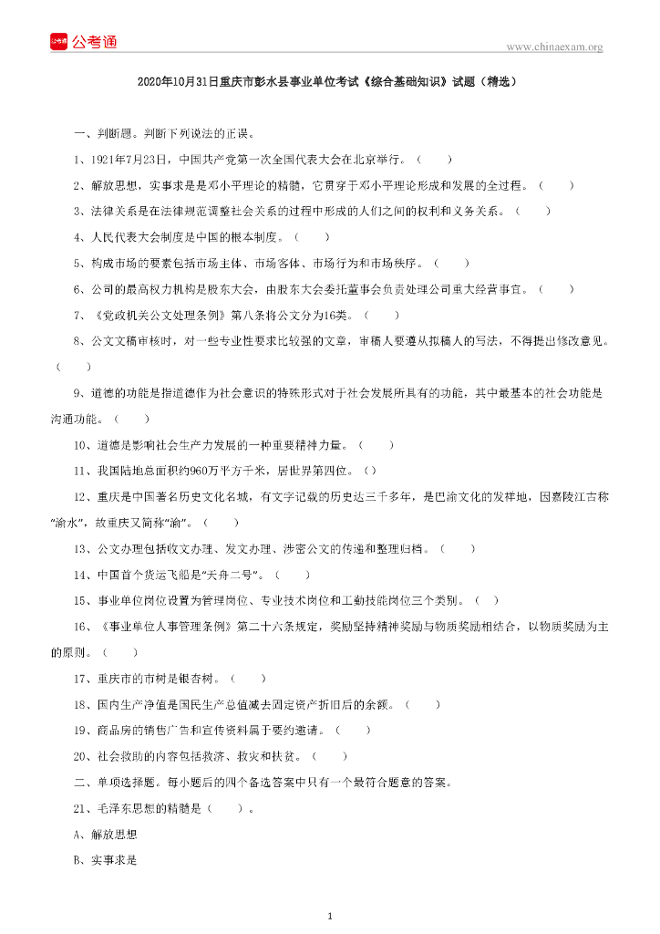 2020年10月31日重庆市彭水县事业单位考试《综合基础知识》试题(精选).pdf