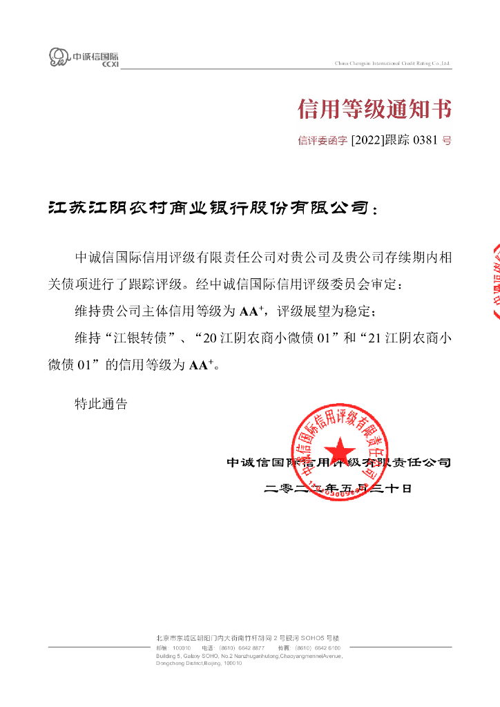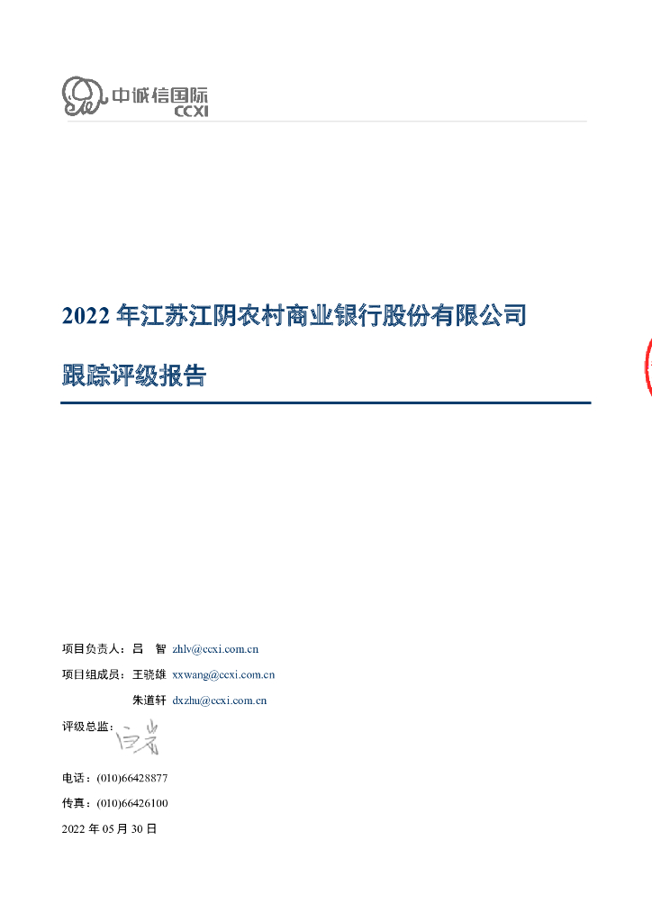 中诚信:2022年江苏江阴农村商业银行股份有限公司跟踪评级报告.pdf