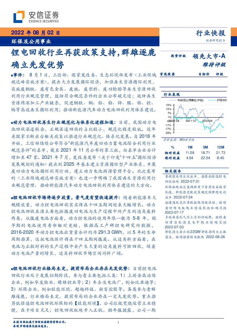 安信证券:环保及公用事业:锂电回收行业再获政策支持,群雄逐鹿确立先发优势.pdf