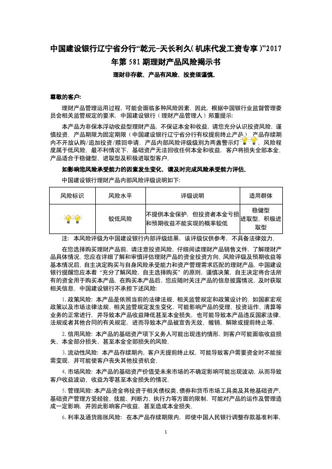中国建设银行辽宁省分行“乾元-天长利久(机床代发工资专享)”2017 年第 581 期理财产品风险揭示书.pdf