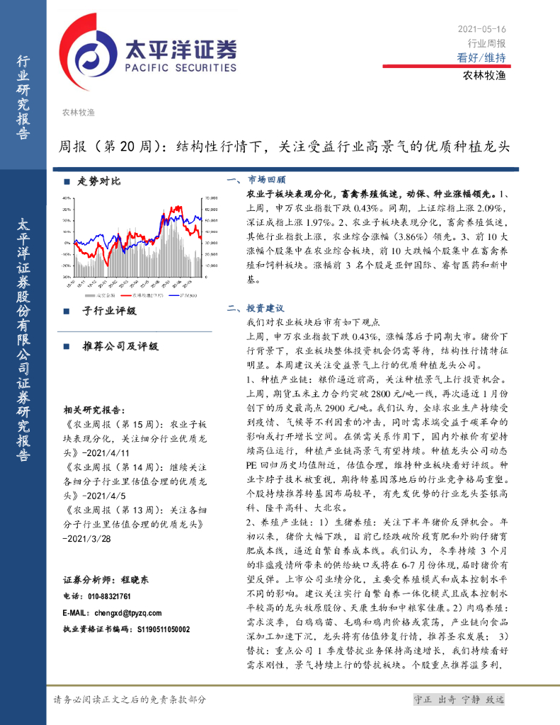 太平洋证券:农林牧渔周报(第20周):结构性行情下,关注受益行业高景气的优质种植龙头.pdf
