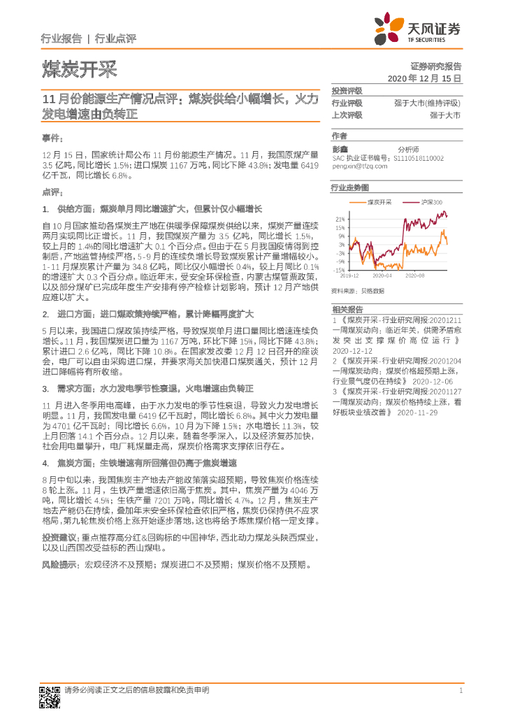 天风证券:煤炭开采行业:11月份能源生产情况点评:煤炭供给小幅增长,火力发电增速由负转正.pdf