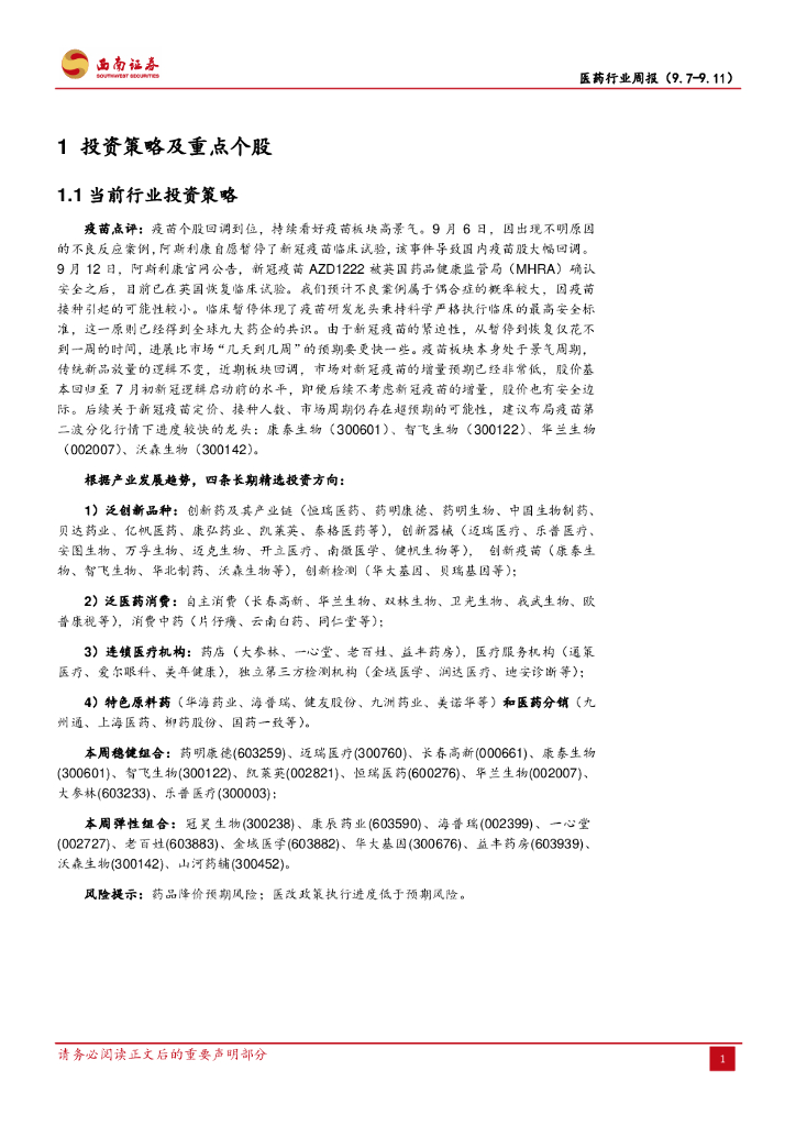 西南证券:医药行业周报:疫苗个股回调到位,持续看好疫苗板块高景气.pdf
