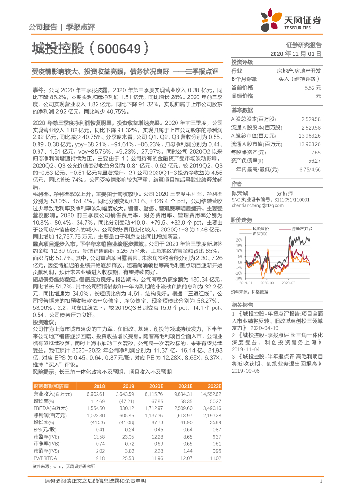 天风证券:城投控股(600649)-三季报点评:受疫情影响较大、投资收益亮眼,债务状况良好.pdf