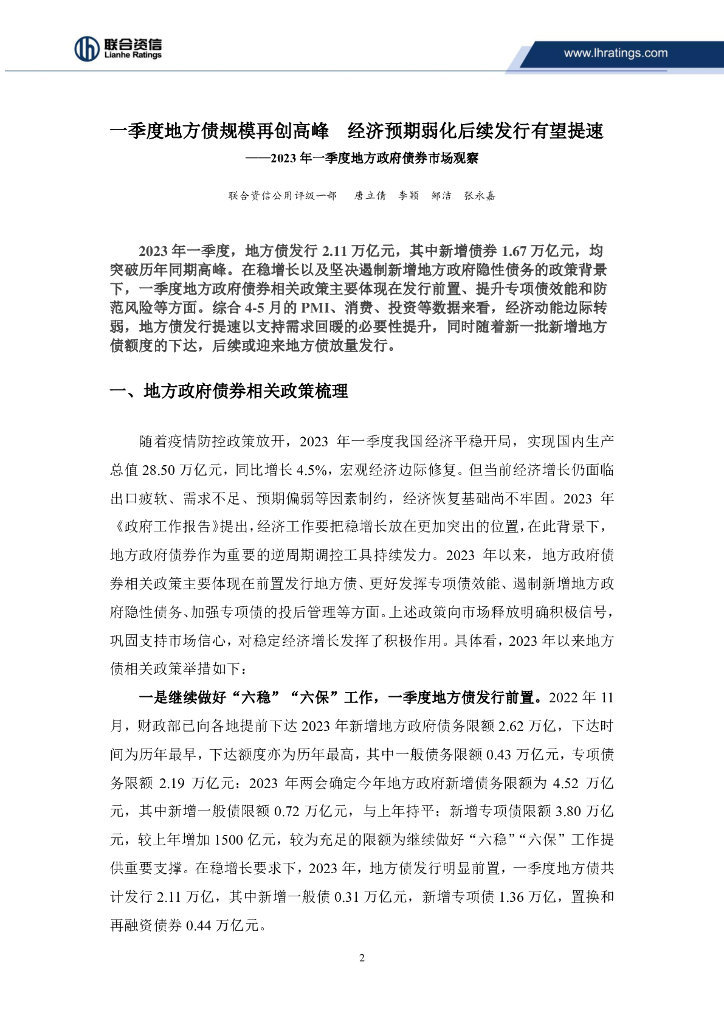 联合资信:一季度地方债规模再创高峰 经济预期弱化后续发行有望提速——2023年一季度地方政府债券市场观察.pdf