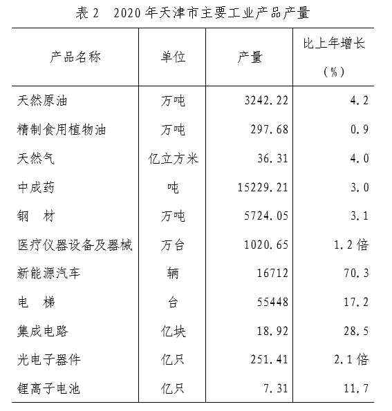 新动能引领作用凸显。新产业加快发展,全年高技术产业(制造业)增加值增长4.6%,快于规上工业3.0个百分点,比上年加快1.5个百分点,占比为15.4%,提高1.4个百分点;工业战略性新兴产业增加值增长4.4%,快于规上工业2.8个百分点,比上年加快0.6个百分点,占比为26.1%,提高5.3个百分点。高技术服务业和战略性新兴服务业营业收入分别增长5.4%和4.9%,均快于规模以上服务业平均水平,占比分别超过1/3和1/4;新兴服务业逆势快速增长,互联网和相关服务营业收入增长16.1%,研究和试验发展增长18.5%,软件和信息技术服务业增长9.5%,直播带货、远程办公、在线教育、互联网医疗等新模式快速发展。新动能投资增长较快,高技术产业投资增长14.0%,战略性新兴产业投资增长1.8%,智能制造投资增长22.9%。部分电子及新产品产量保持较快增长,服务机器人产量增长1.6倍,电子计算机增长93.3%,新能源汽车增长70.3%,电子元件增长35.4%,集成电路增长28.5%,光电子器件增长2.1倍。信息安全、动力电池入选全国20个先进制造业集群。“中国信创谷”、“细胞谷”、“生物制造谷”、“北方声谷”、市数字经济产业创新中心等新增长点正在形成。天津(西青)国家级车联网先导区揭牌,天津经济技术开发区入选首批国家数字服务出口基地。