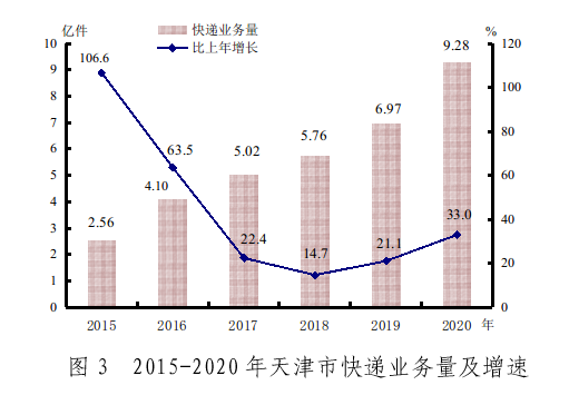 邮电业快速增长。全年邮电业务总量1779.54亿元,增长32.4%。其中,电信业务总量1584.94亿元,增长32.6%;邮政行业业务总量194.60亿元,增长30.8%。全年快递业务量9.28亿件,增长33.0%。年末固定电话用户325.81万户,移动电话用户1711.01万户,固定互联网宽带接入用户534.60万户。提速“两网”建设,移动宽带、固定宽带下载速率均跃居全国第3位;累计建成5G基站2.4万个,完成中国北方首条2.6GHz频段5G智能网联测试道路建设,“5G+智慧教育”获批国家级智慧应用试点。围绕智慧城市、智慧港口、智能制造等重点领域打造150个5G应用场景。西青区、津南区入选国家数字乡村试点地区。