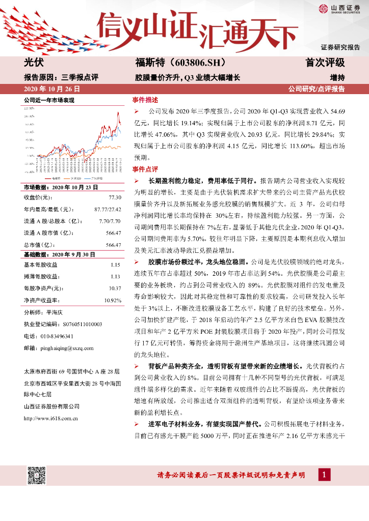 山西证券:福斯特(603806)-胶膜量价齐升,Q3业绩大幅增长.pdf