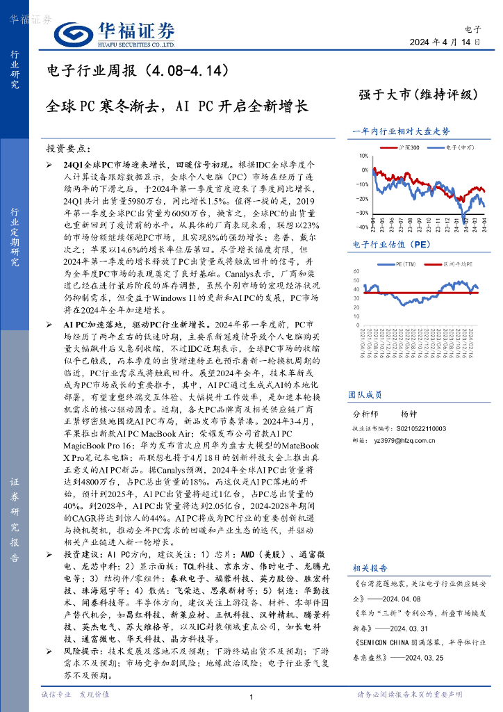 华福证券:电子行业周报:全球PC寒冬渐去,AIPC开启全新增长.pdf