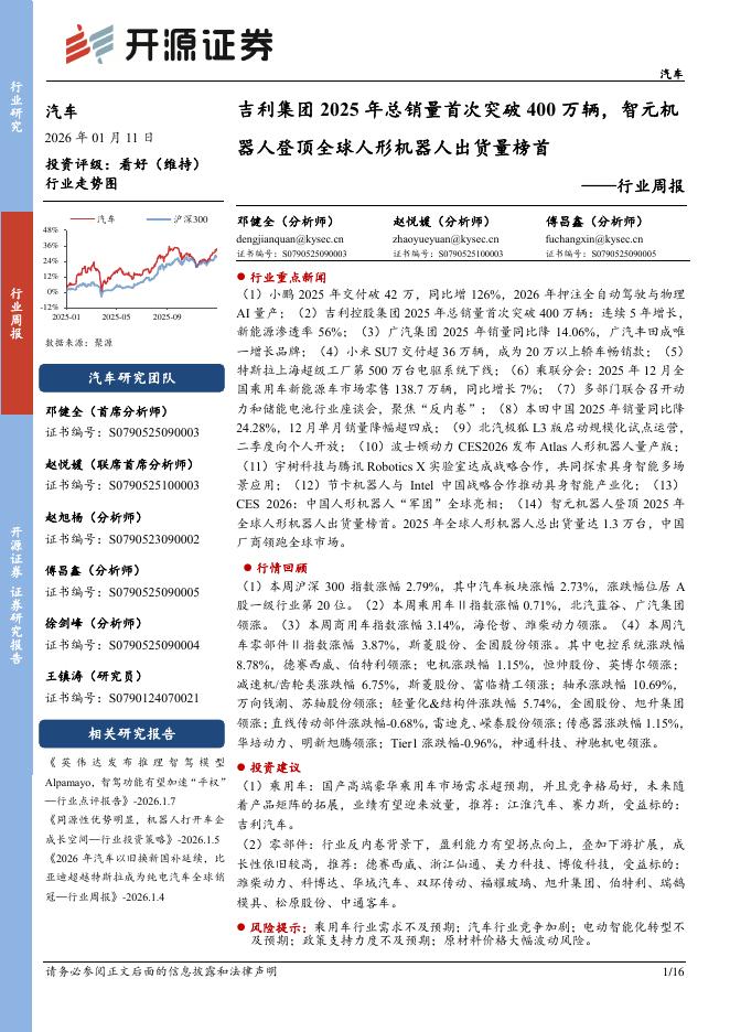 开源证券:汽车行业周报:吉利集团2025年总销量首次突破400万辆,智元机器人登顶全球人形机器人出货量榜首.pdf