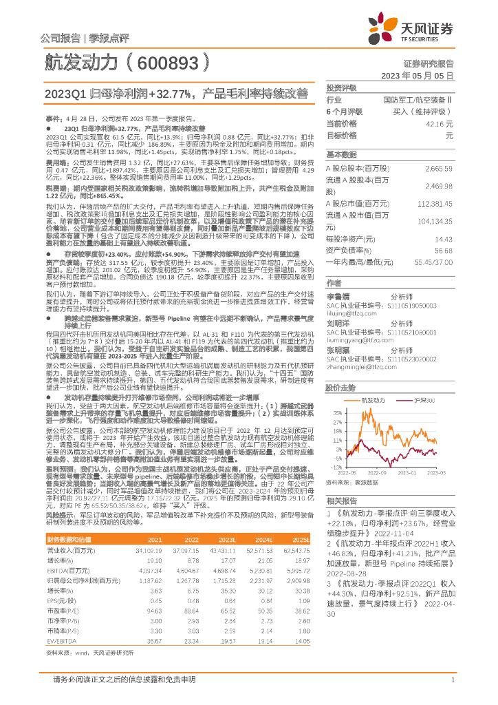天风证券:航发动力(600893)-2023Q1归母净利润+32.77%,产品毛利率持续改善.pdf