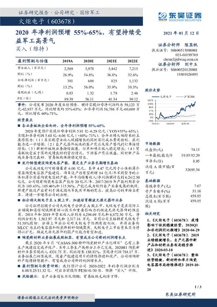 东吴证券:火炬电子(603678)-2020年净利润预增55%-65%,有望持续受益军工高景气.pdf