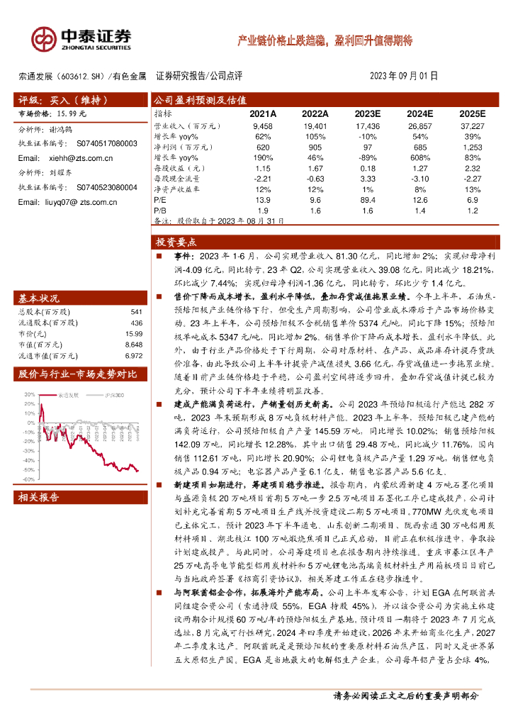 中泰证券:索通发展(603612)-产业链价格止跌趋稳,盈利回升值得期待.pdf