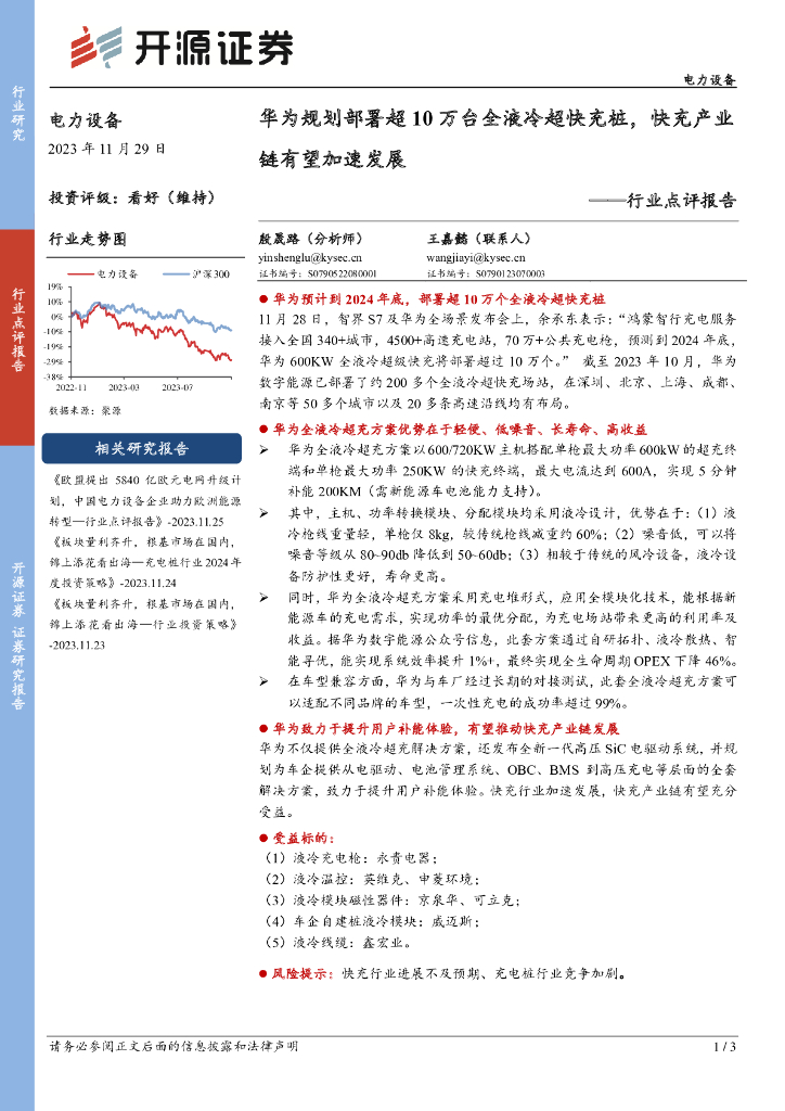 开源证券:电力设备行业点评报告:华为规划部署超10万台全液冷超快充桩,快充产业链有望加速发展.pdf