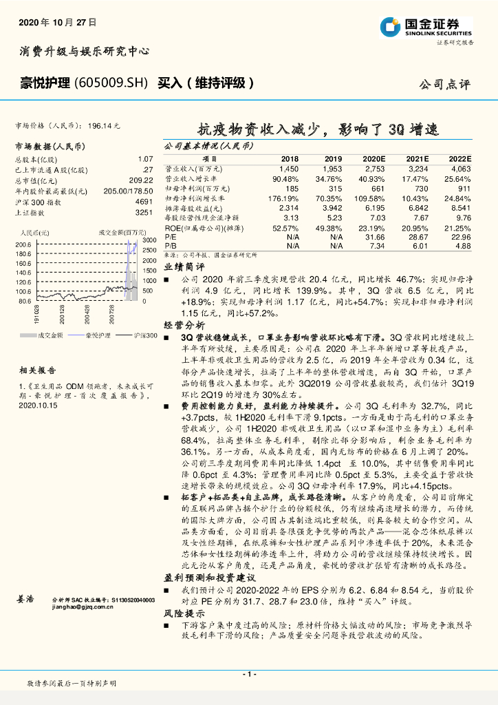 国金证券:豪悦护理(605009)-抗疫物资收入减少,影响了3Q增速.pdf