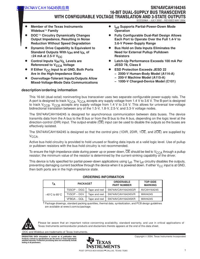 TEXAS INSTRUMENTS SN74AVCAH164245 数据手册.pdf