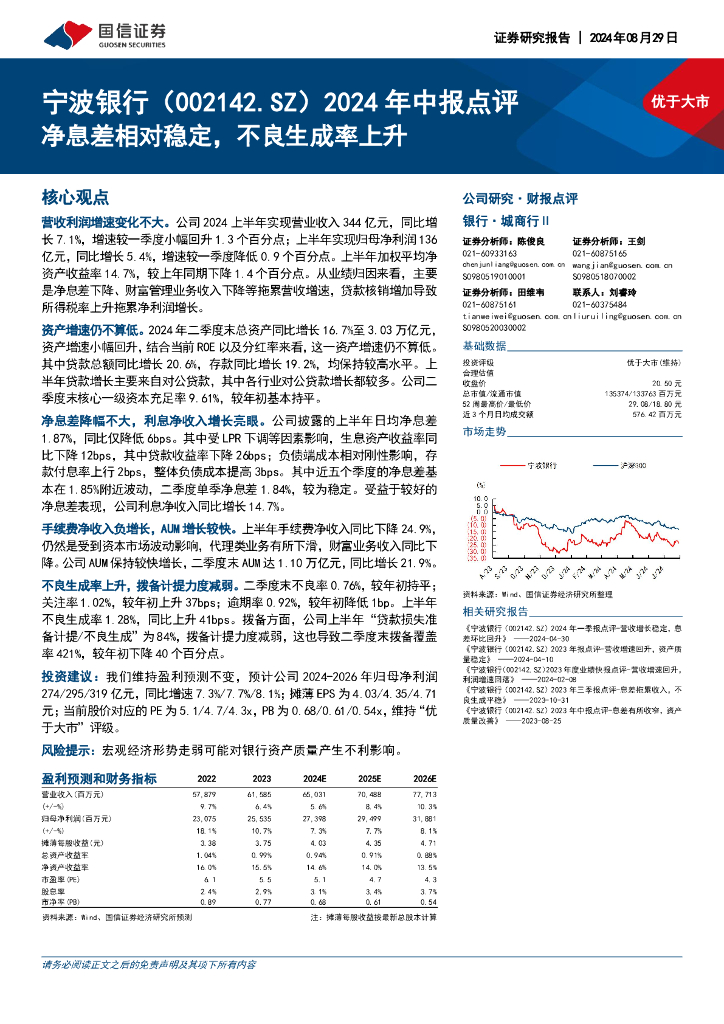 国信证券:宁波银行(002142)-2024年中报点评:净息差相对稳定,不良生成率上升.pdf