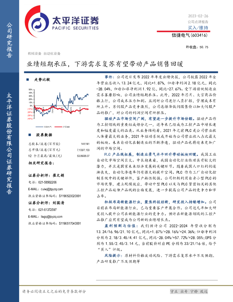 太平洋证券:信捷电气(603416)-业绩短期承压,下游需求复苏有望带动产品销售回暖.pdf