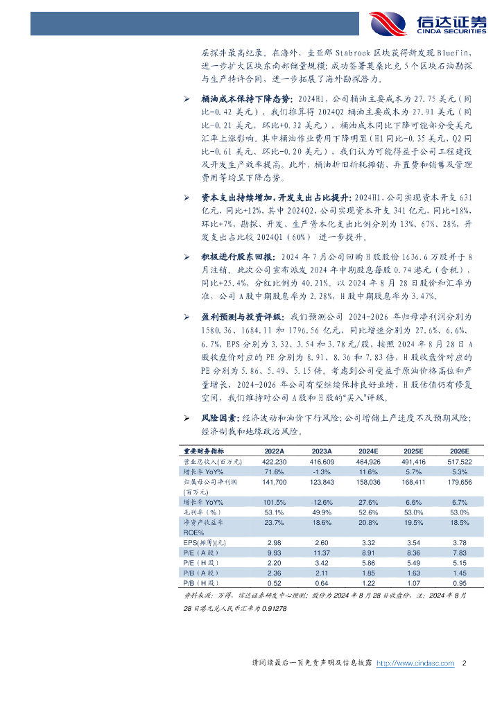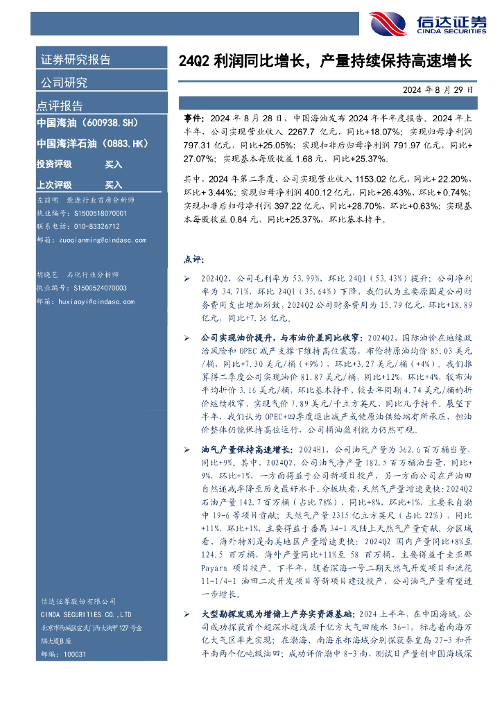 信达证券:中国海油(600938)-24Q2利润同比增长,产量持续保持高速增长.pdf