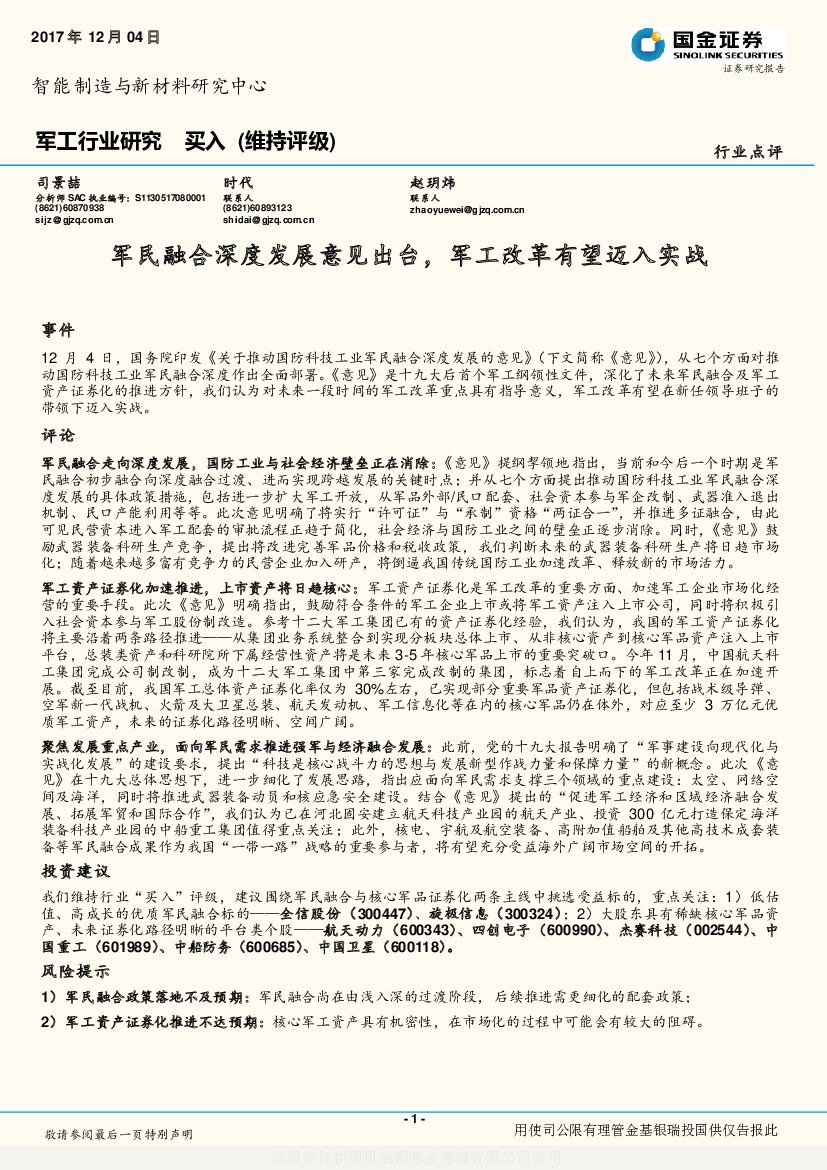 国金证券:军工行业研究:军民融合深度发展意见出台,军工改革有望迈入实战.pdf