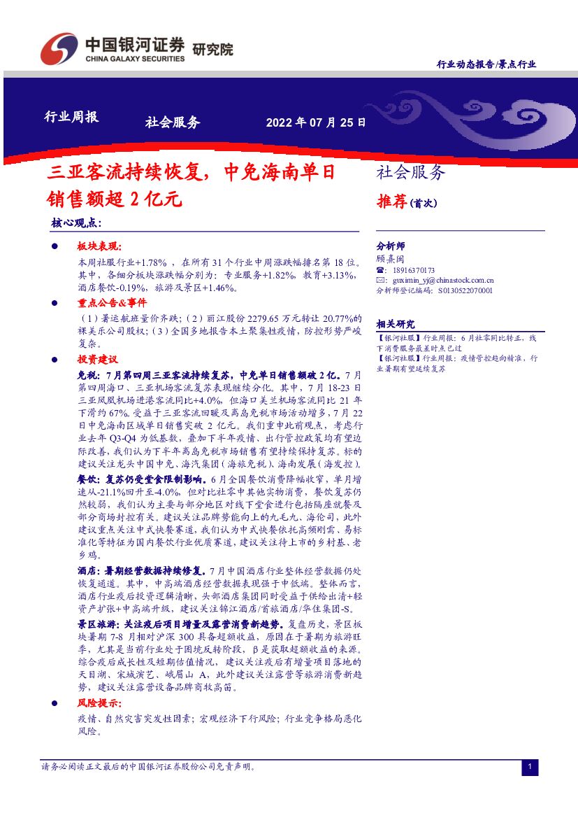 中国银河:社会服务行业周报:三亚客流持续恢复,中免海南单日销售额超2亿元.pdf