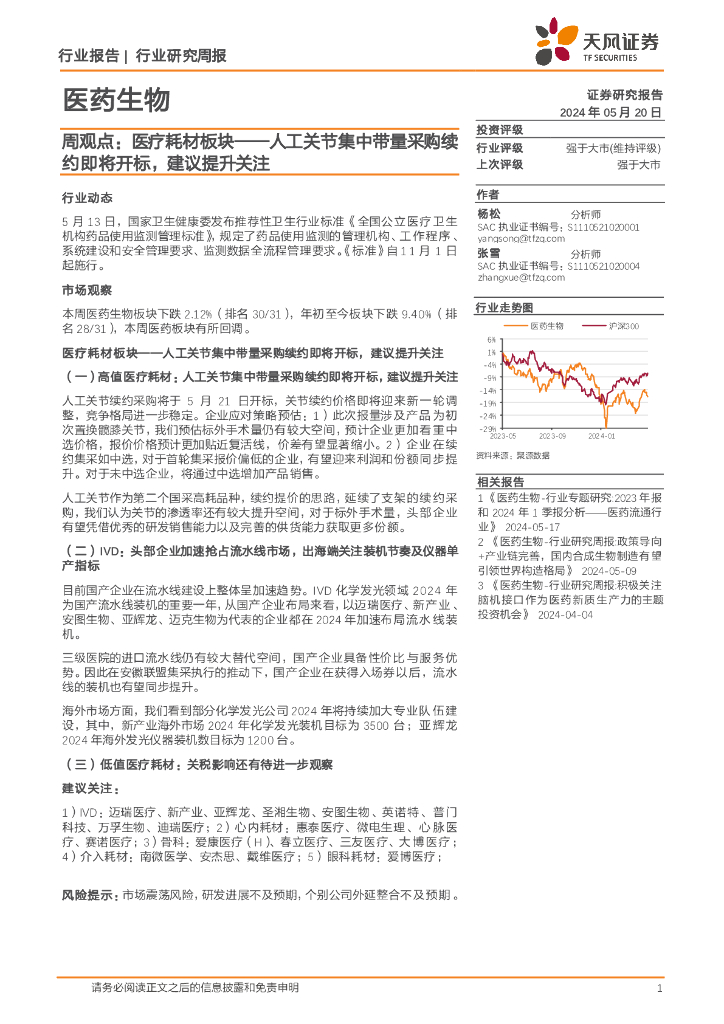 天风证券:医药生物行业周观点:医疗耗材板块,人工关节集中带量采购续约即将开标,建议提升关注.pdf