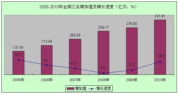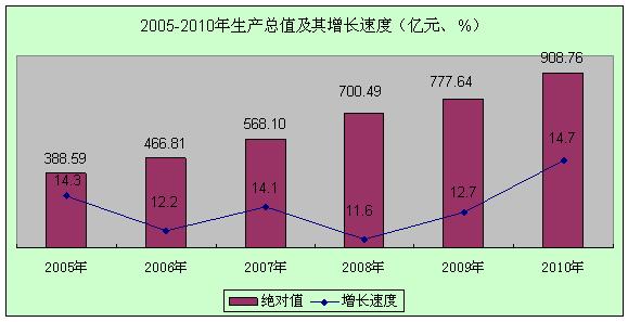 初步核算,2010年全年生产总值908.76亿元,比上年增长14.7%。其中:第一产业增加值140.23亿元,增长6.6%;第二产业增加值367.82亿元,增长19.1%;第三产业增加值400.70万元,增长13.5%。第一产业增加值占生产总值的比重为15.4%,比上年下降了0.4个百分点;第二产业增加值比重为40.5%,上升0.6个百分点;第三产业增加值比重为44.1%,下降0.2个百分点。分季度看,一季度增长13.5%,上半年增长12.6%,前三季度增长13.4%,全年增长14.7%。