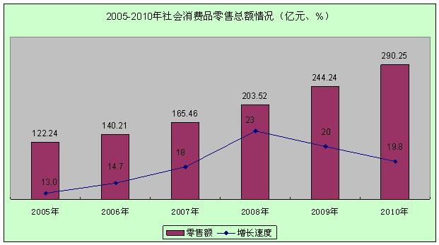 全年社会消费品零售总额290.25亿元,比上年增长19.8%。其中城镇消费品零售额220.95亿元,增长23.2%;乡村消费品零售额69.30亿元,增长10.3%。分行业看,批发、零售、住宿和餐饮业零售额分别为33.17 亿元、224.59亿元、1.38亿元和31.11亿元,分别增长29.0%、18.9%、16.9%和17.4%。
