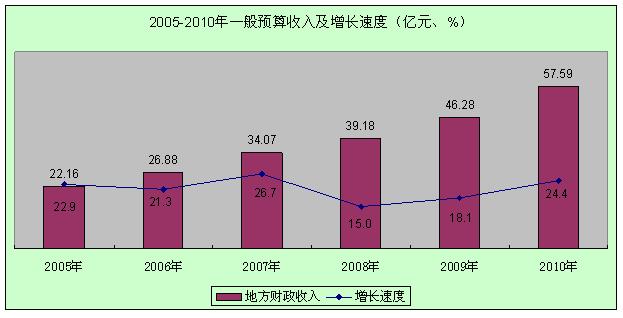 全年财政总收入141.30亿元,增长22.8%。其中,一般预算收入57.59亿元,增长24.4%。各种税收收入45.88亿元,增长25.7%;非税收入11.72亿元,增长19.7%。全年一般预算支出192.70亿元,增长25.0%,其中一般公共服务支出25.99亿元,增长7.5%,教育事业支出42.02亿元,增长13.8%,社会保障和就业18.09亿元,增长9.1%。