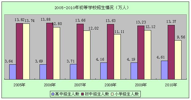 2010年,全市“普九”人口覆盖率继续巩固100.0%的成果。年末有各级各类学校数3074所。专任教师6.51万人,比上年下降2.2%。在校学生137.45万人,比上年下降5.1%。全市小学适龄儿童入学率91.2%,初中阶段毛入学率93.8%,高中阶段毛入学率52.8%。