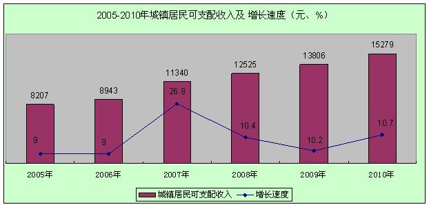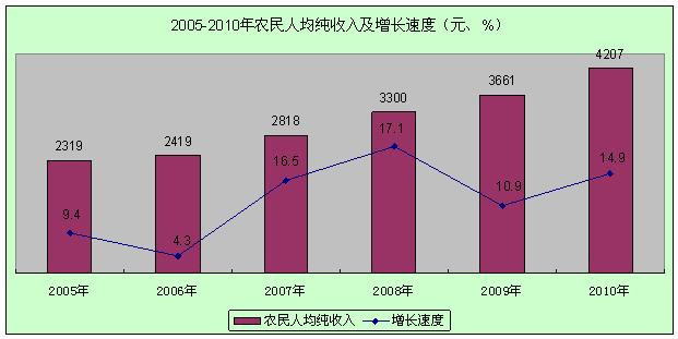 全年农村居民人均纯收入4207元,同比增长14.9%,扣除价格上涨因素实际增长12.0%;城镇居民人均可支配收入15279元,同比增长10.7%,扣除价格上涨因素实际增长7.1%。农村居民家庭恩格尔系数(即食品消费支出占消费总支出的比重)为47.4%,城镇居民家庭恩格尔系数为38.3%。