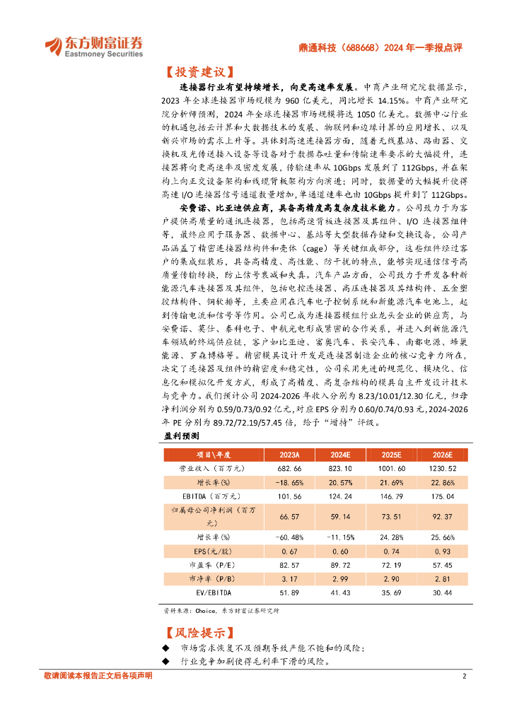 东方财富证券:鼎通科技(688668)-2024年一季报点评:23年承压,24Q1环比复苏,积极布局112G连接器组件.pdf