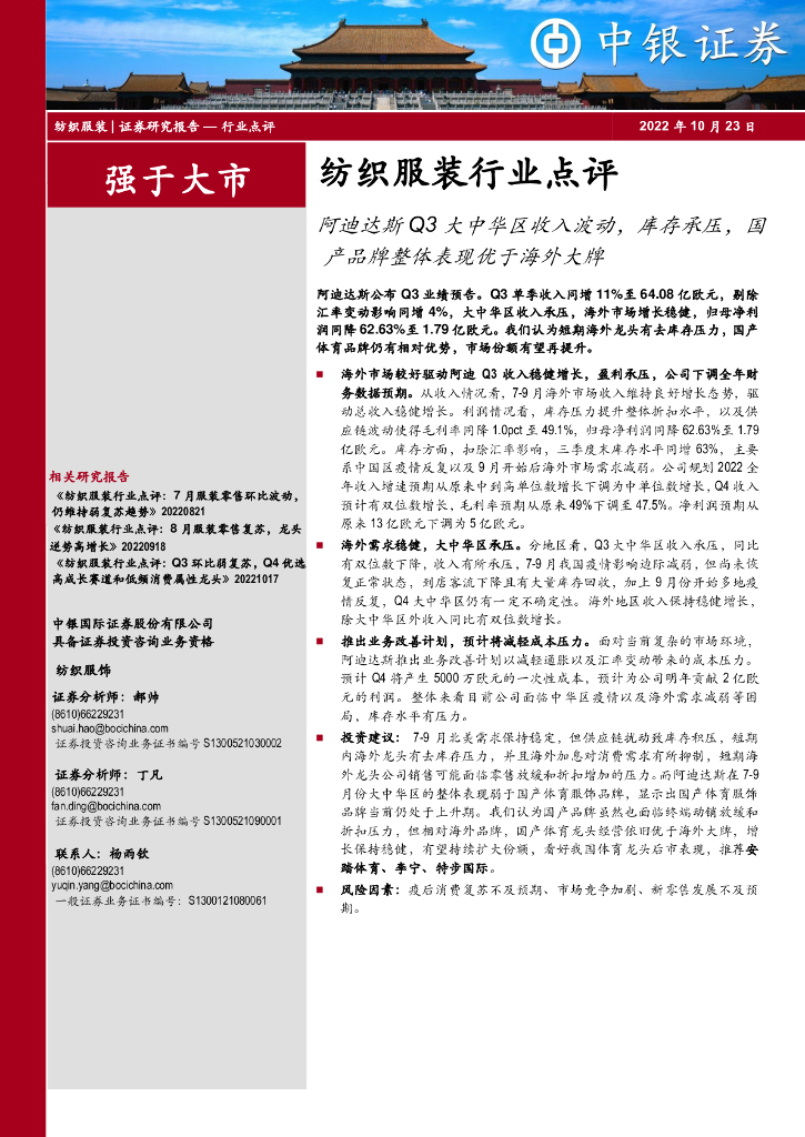 中银证券:纺织服装行业点评:阿迪达斯Q3大中华区收入波动,库存承压,国产品牌整体表现优于海外大牌.pdf