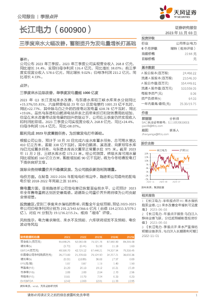 天风证券:长江电力(600900)-三季度来水大幅改善,蓄能提升为发电量增长打基础.pdf
