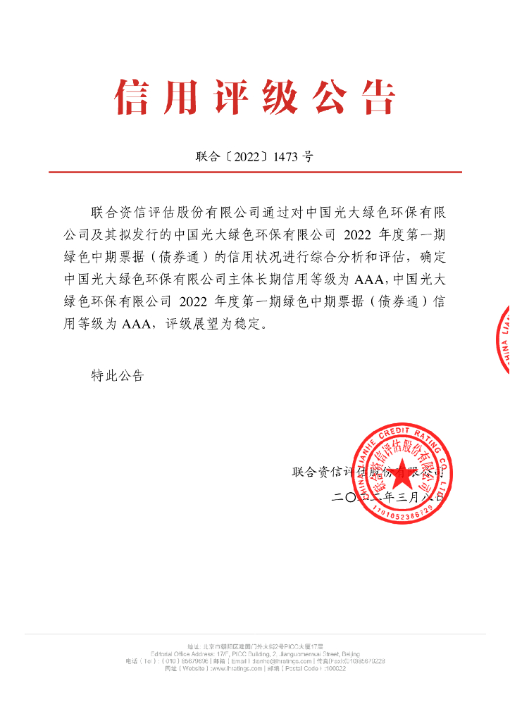联合资信:中国光大绿色环保有限公司2022年度第一期绿色中期票据(债券通)信用评级报告.pdf