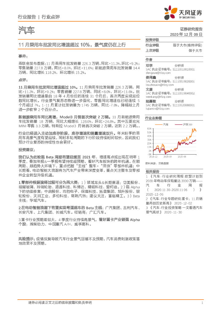 天风证券:汽车行业报告:11月乘用车批发同比增速超过10%,景气度仍在上行.pdf