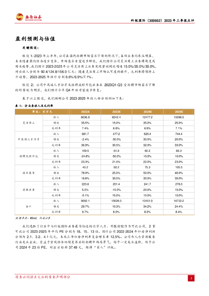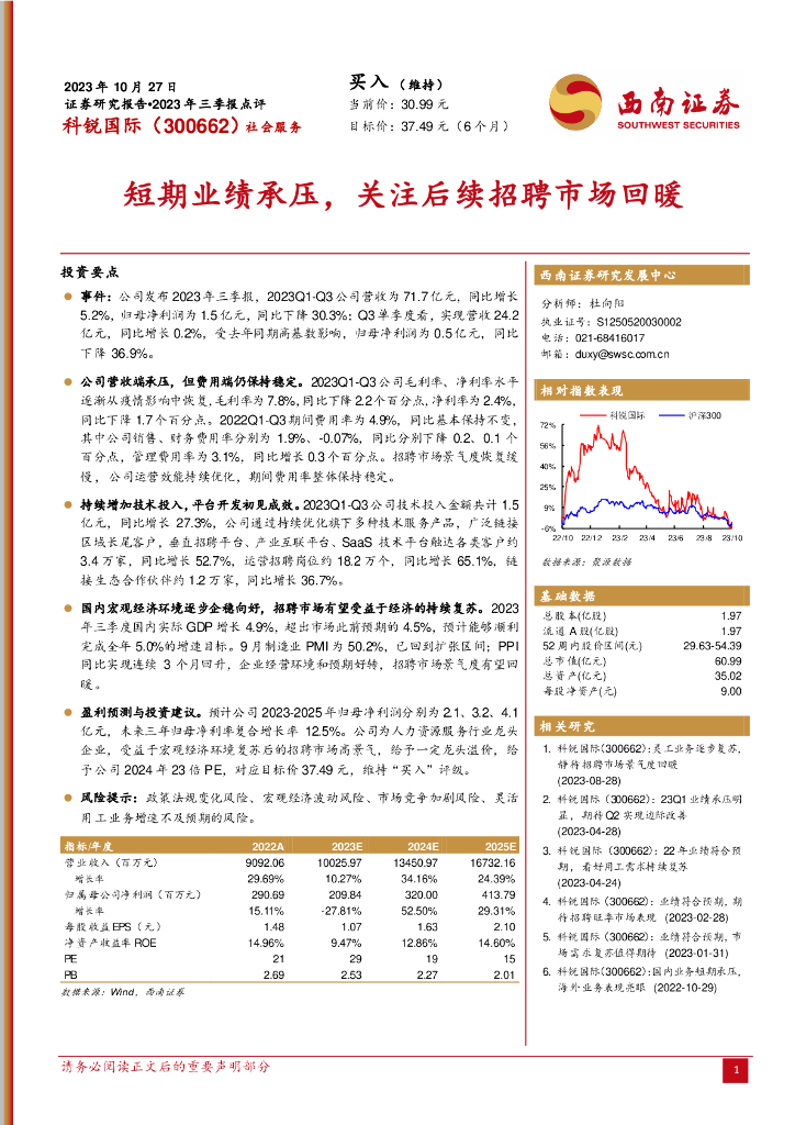 西南证券:科锐国际(300662)-2023年三季报点评:短期业绩承压,关注后续招聘市场回暖.pdf
