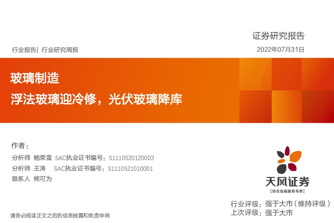 天风证券:玻璃制造行业研究周报:浮法玻璃迎冷修,光伏玻璃降库.pdf