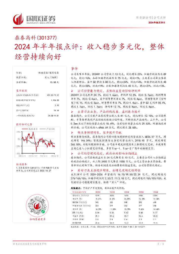国联证券:鼎泰高科(301377)-2024年半年报点评:收入稳步多元化,整体经营持续向好.pdf