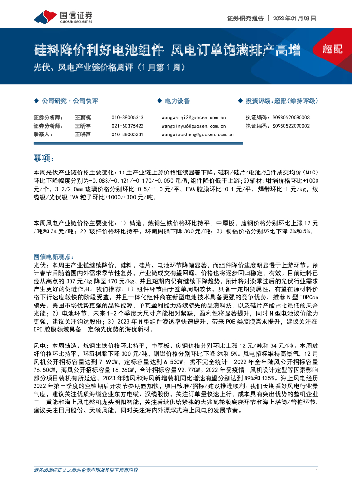 国信证券:光伏、风电产业链价格周评(1月第1周):硅料降价利好电池组件 风电订单饱满排产高增.pdf