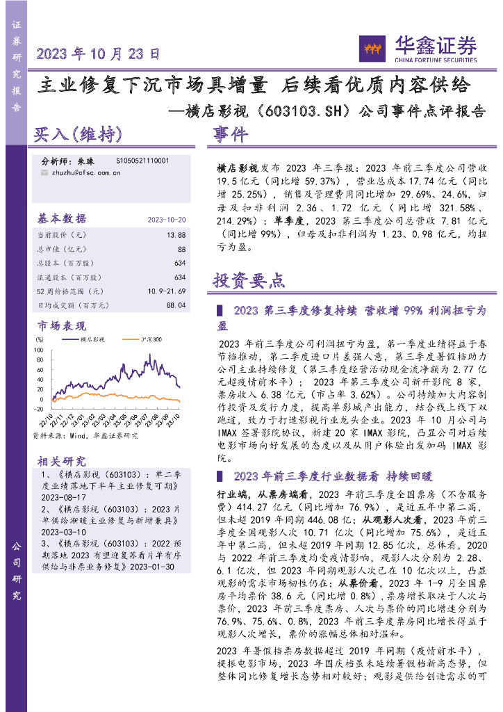 华鑫证券:横店影视(603103)-公司事件点评报告:主业修复下沉市场具增量 后续看优质内容供给.pdf