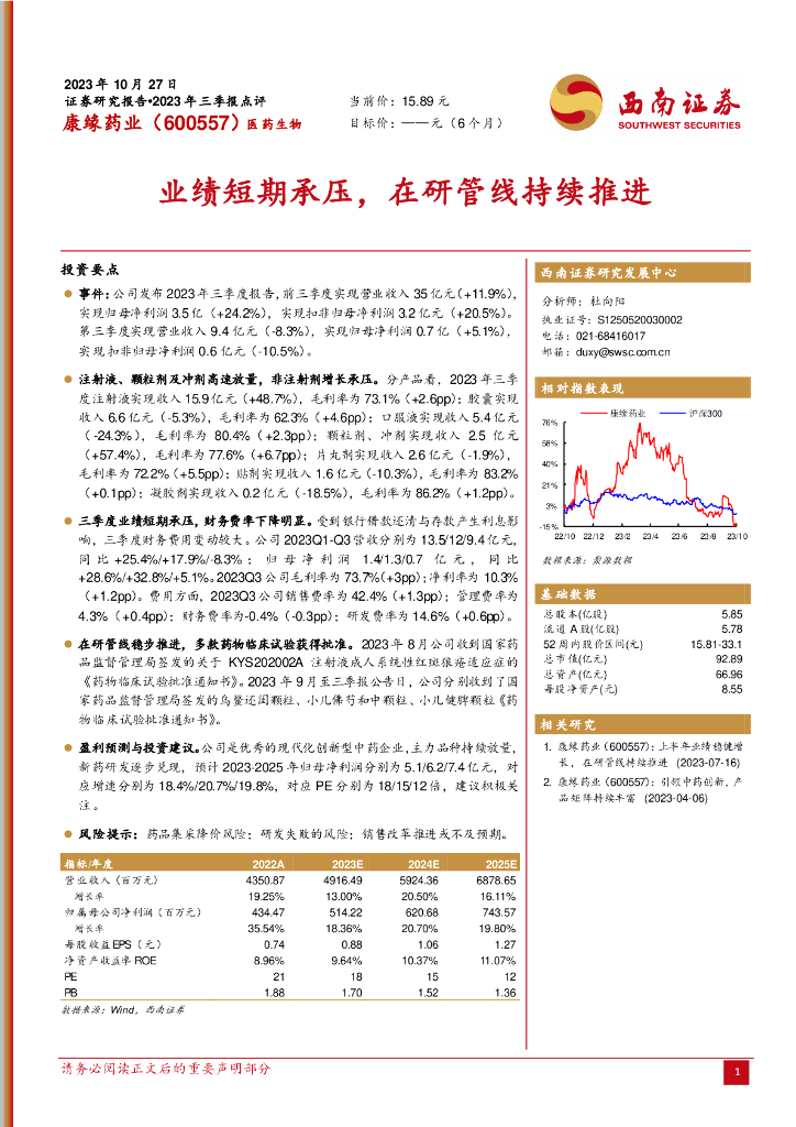 西南证券:康缘药业(600557)-业绩短期承压,在研管线持续推进.pdf
