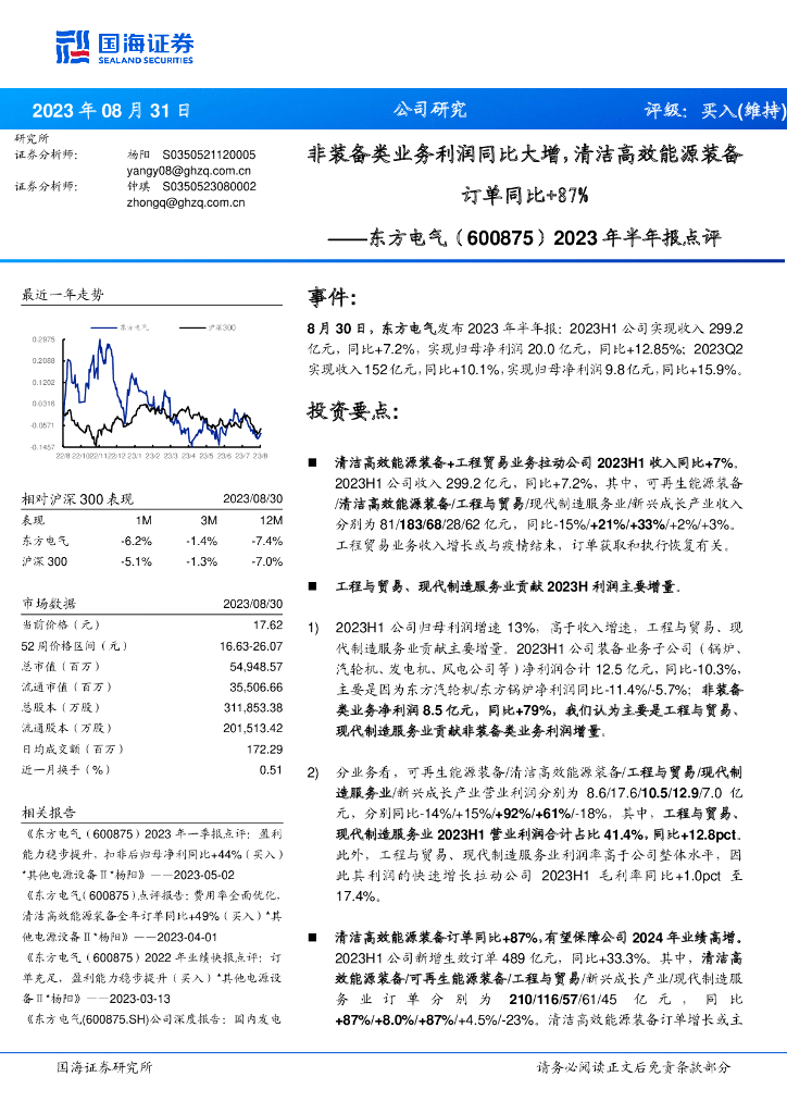 国海证券:东方电气(600875)-2023年半年报点评:非装备类业务利润同比大增,清洁高效能源装备订单同比+87%.pdf