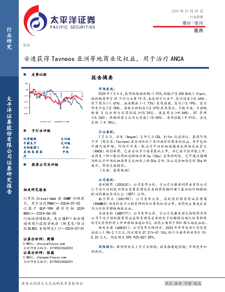 太平洋证券:医药行业周报:安进获得Tavneos亚洲等地商业化权益,用于治疗ANCA.pdf