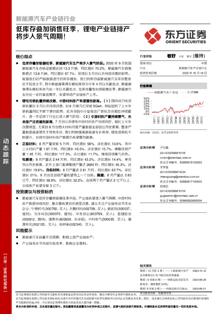 东方证券:新能源汽车产业链行业:低库存叠加销售旺季,锂电产业链排产将步入景气周期!.pdf