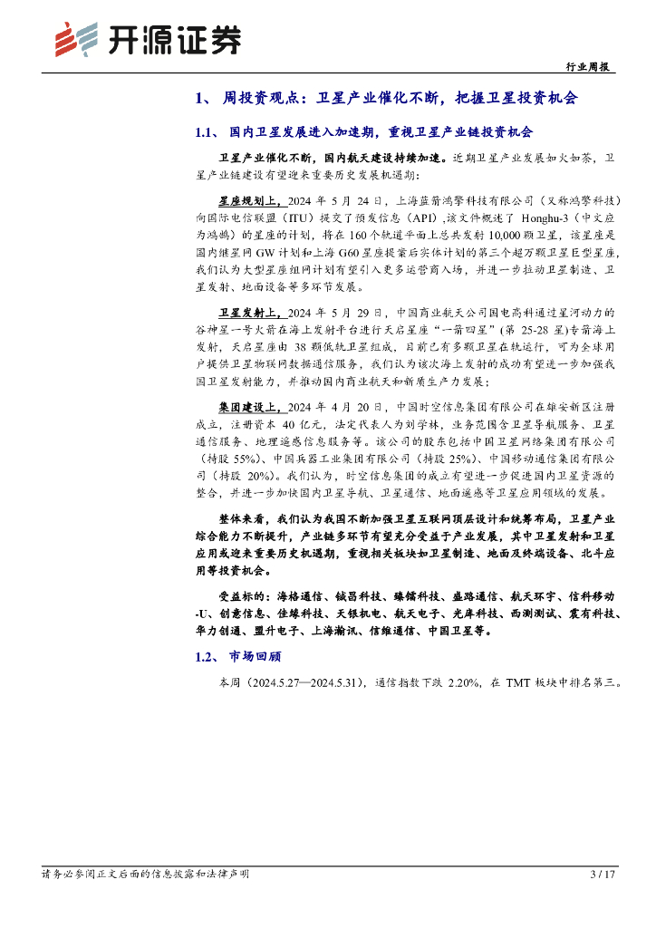 开源证券:通信行业周报:卫星产业催化不断,把握卫星投资机会.pdf