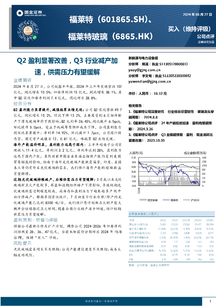 国金证券:福莱特(601865)-Q2盈利显著改善,Q3行业减产加速,供需压力有望缓解.pdf