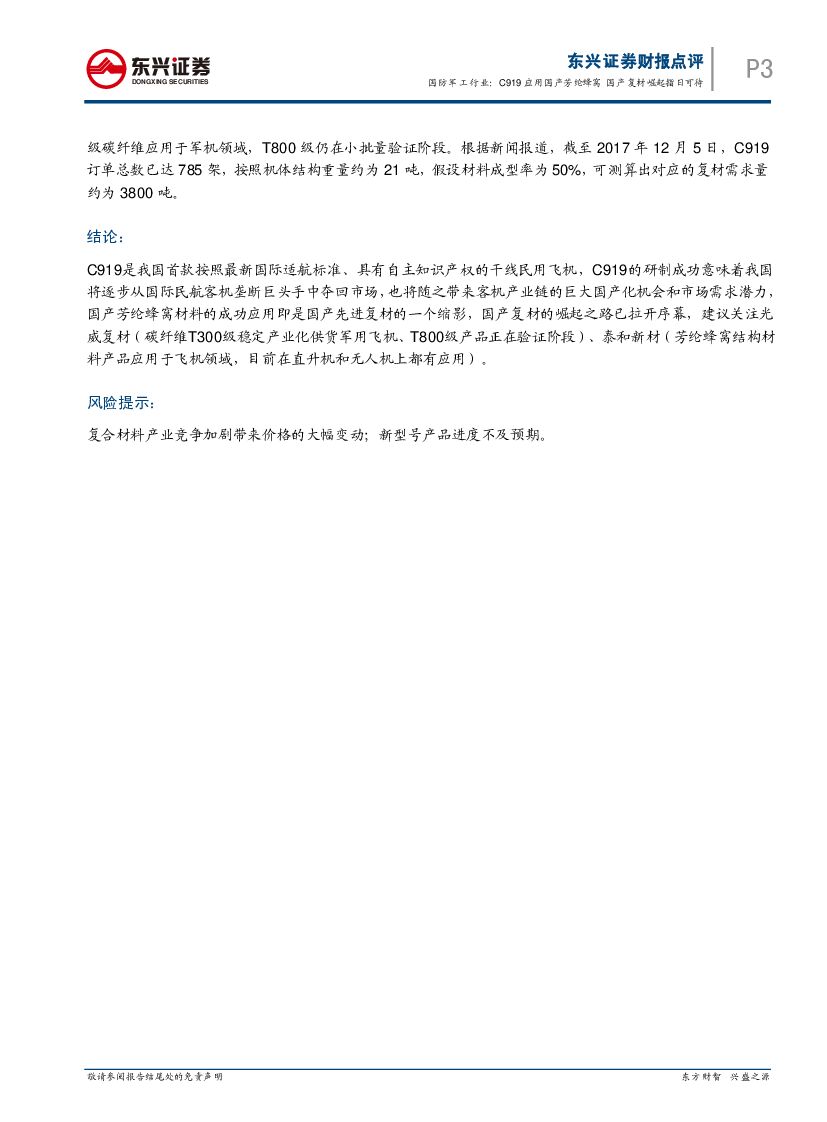 东兴证券:国防军工行业事件点评:C919应用国产芳纶蜂窝 国产复材崛起指日可待.pdf