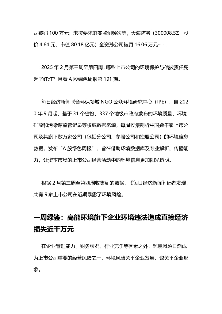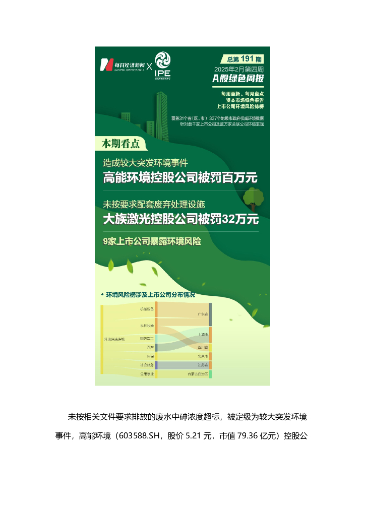 A股绿色周报(2025年2月第四周 总第191期):9家上市公司暴露环境风险 高能环境控股公司造成较大突发环境事件,被罚100 万元.pdf