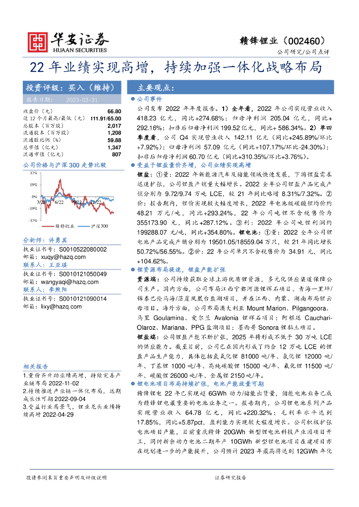 华安证券:赣锋锂业(002460)-22年业绩实现高增,持续加强一体化战略布局.pdf